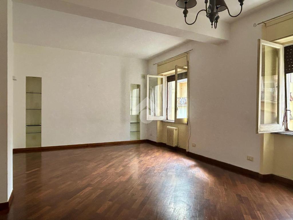 A destra troviamo il soggiorno doppio, ampio e accogliente, servito da due infissi finestrati.