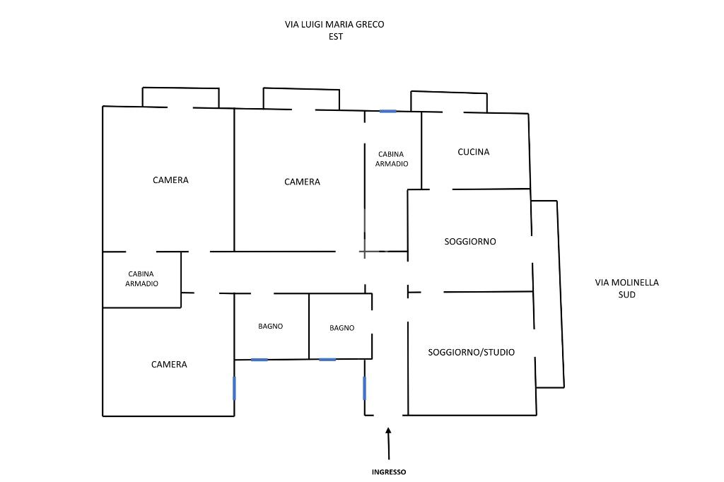 Proseguendo sulla sinistra troviamo la zona notte, costituita da tre camere, tutte di ampia metratura e luminose. Due di esse sono ciascuna affiancate da un comodo ripostiglio, pensato per essere facilmente trasformato in cabina armadio. Inoltre sono servite da altri due balconcini.