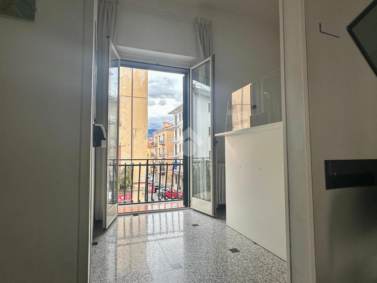 Accediamo nell'appartamento tramite portoncino blindato e un piccolo corridoio ci accompagna verso la zona giorno. Attualmente il soggiorno è composto da due grandi ambienti, serviti da un primo balcone con affaccio sulla strada principale e verso la piazza, esposto a sud.